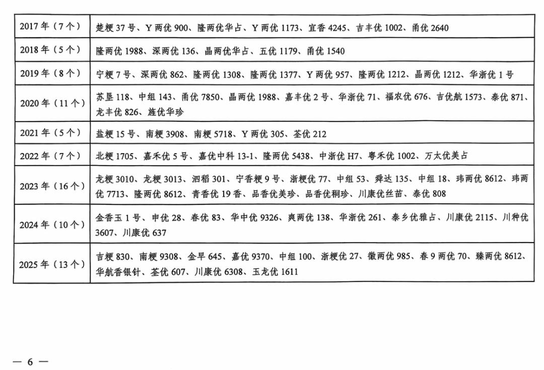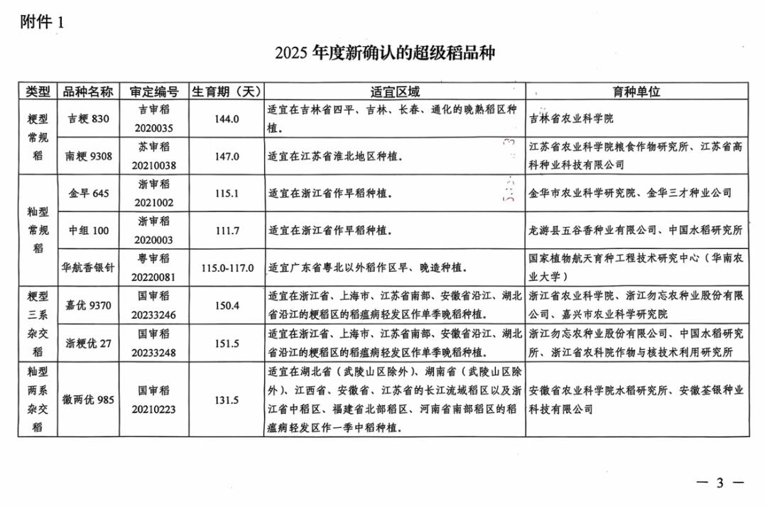 现确认吉粳830、南粳9308、金早645、嘉优9370、中组100、浙粳优 27、徽两优985、春9两优70、臻两优8612、华航香银针、荃优607、川康优6308、玉龙优1611等13个品种为2025年度超级稻品种(附件1)。