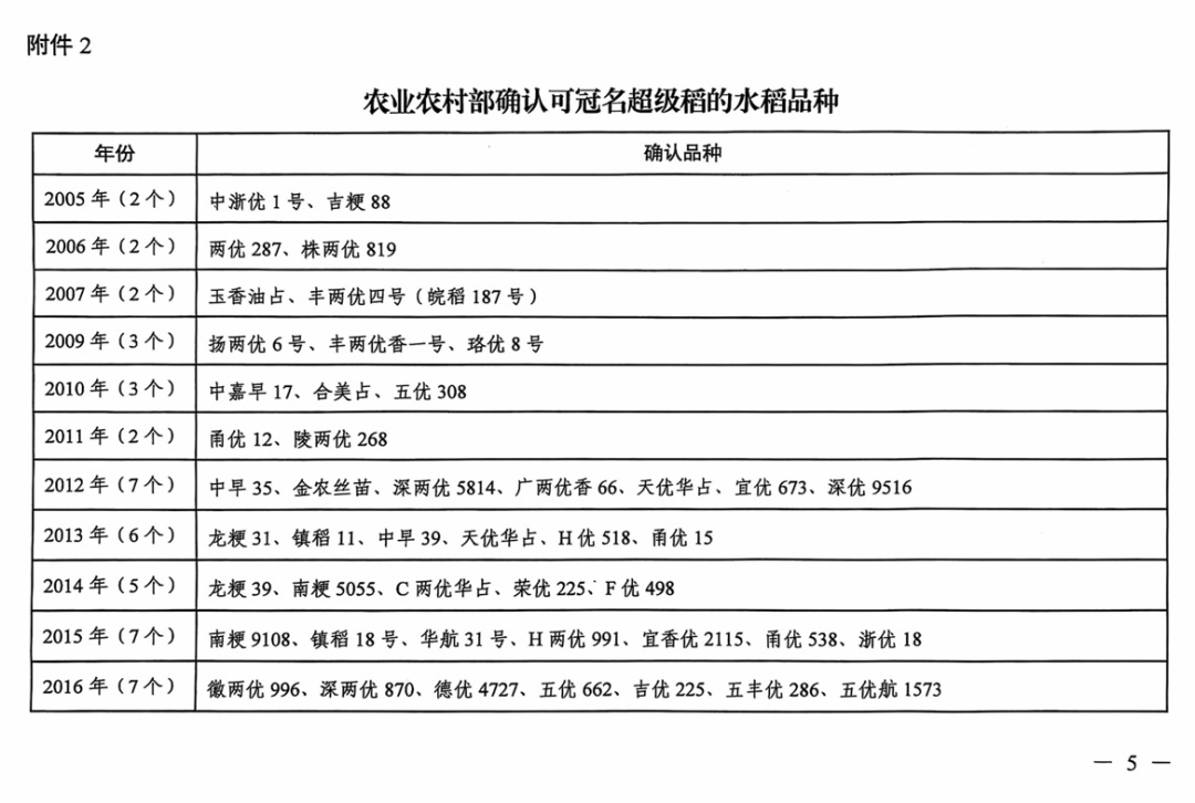 同时,因推广面积未达要求,天优998、桂农占、新两优6 号、辽星1号、天优3301、连粳7号、准两优608、德香4103、Y两优2号、Y两优 5867、五丰优615、蜀优217、和两优713、万太优3158等14个品种不再冠名超级稻。目前,经农业农村部确认、可冠名超级稻的水稻品种共128个(附件2)。