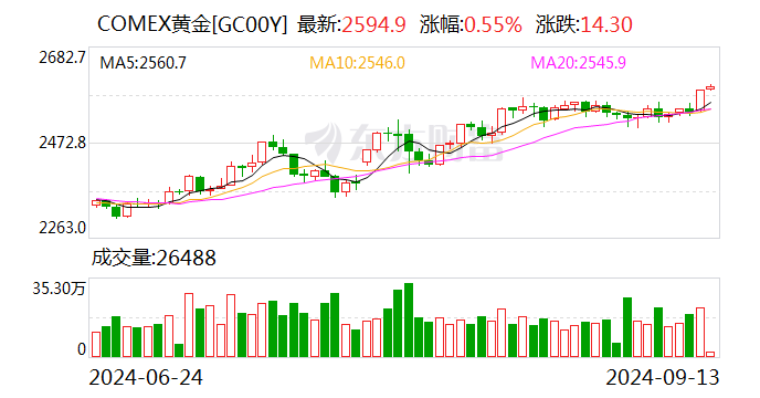 9月12日晚间,现货黄金价格突破了2560美元/盎司前期峰值,至收盘时现货金和COMEX金均创收盘新高。现货黄金收盘涨1.84%,报2558.07美元/盎司;COMEX黄金期货涨1.78%,报2587.6美元/盎司。