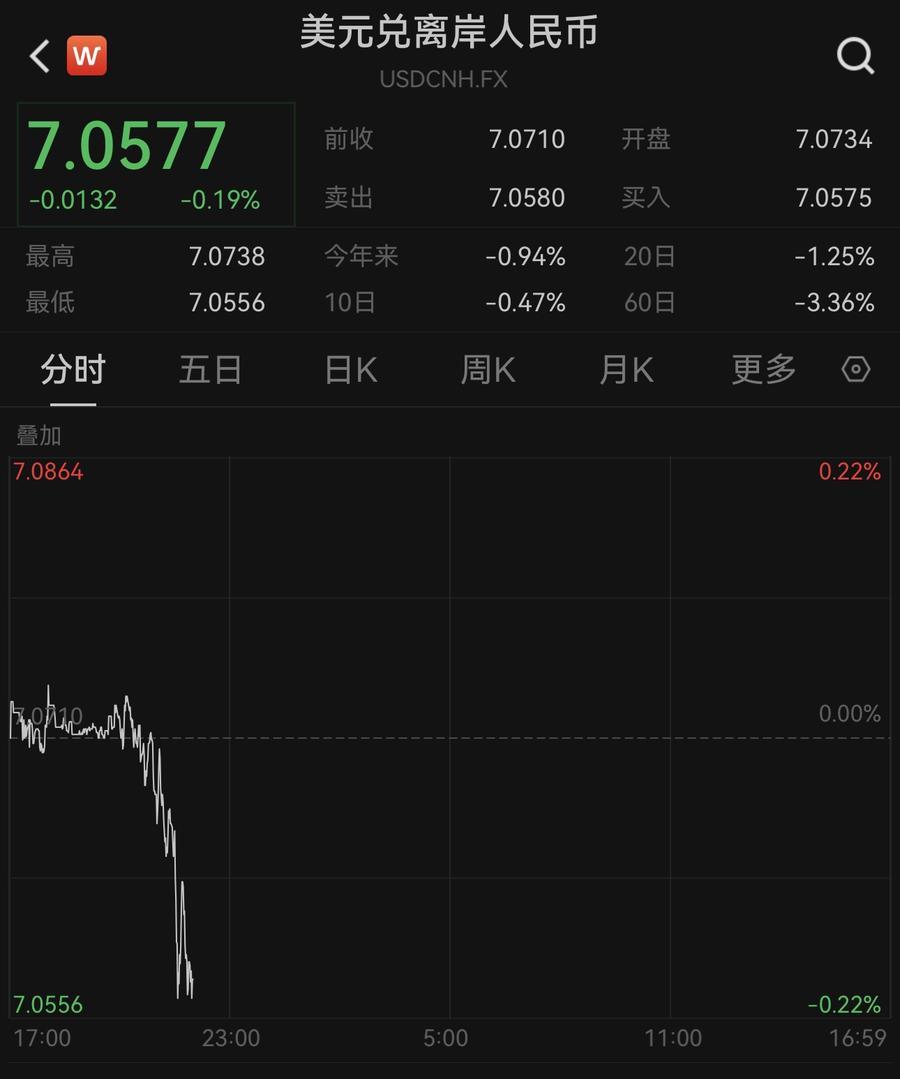 离岸市场上,人民币对美元汇率9月20日同样升破7.06关口,截至发稿,最高至7.0556,较前一交易日升值同样超百点。